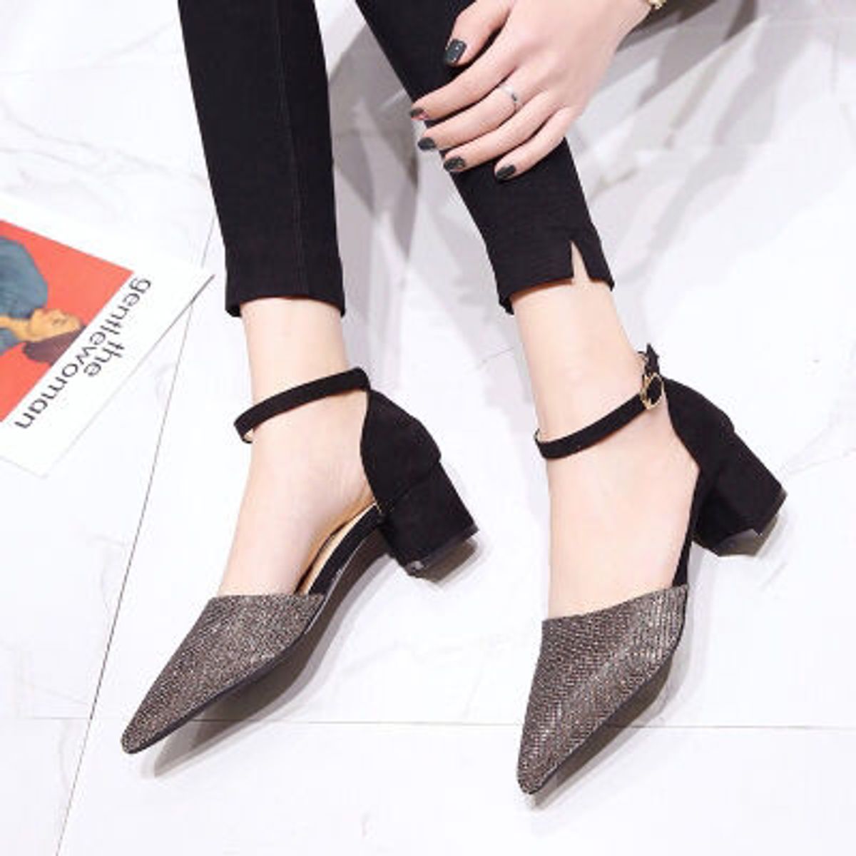 - Giày gót vuông mũi đính kim tuyến, hở eo, bít hậu