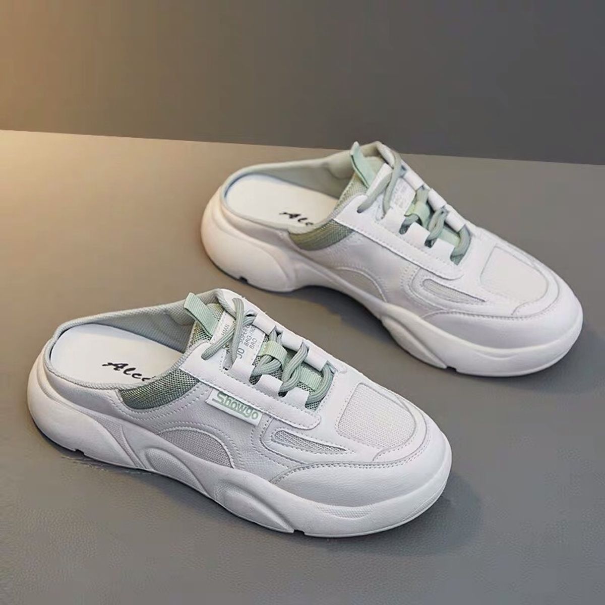 Giày sục thể thao nữ ShowGo - có 2 màu trắng xanh và trắng xám, chất liệu da phối vải cao cấp, đế cao su mềm nhẹ êm ái thoải mái, thời trang hàn quốc cá tính, đẹp giá rẻ, đi học đi chơi đi làm đều được hot trend 2020
