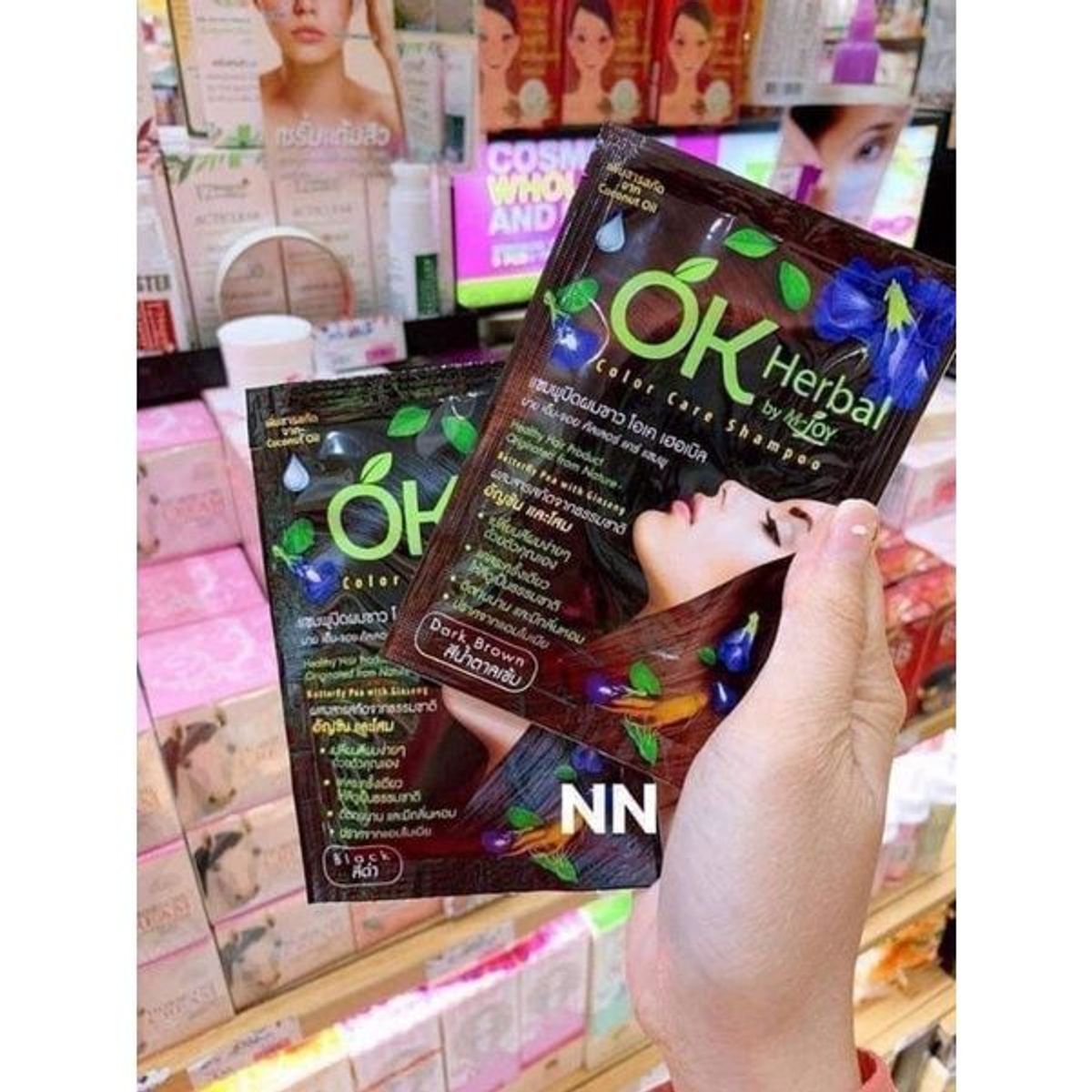 Gói gội nhuộm tóc Nhân sâm Ok Herbal - Thái lan Nhuộm đen hoặc nâu đen sau 20 phút.