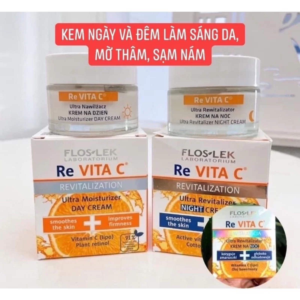 Kem face Floslek Re Vita C 50ml giúp dưỡng sáng da, bảo vệ da khỏi tác hại môi trường và cải thiện sắc tố da, dùng ban ngày hiệu quả 🌞💛.