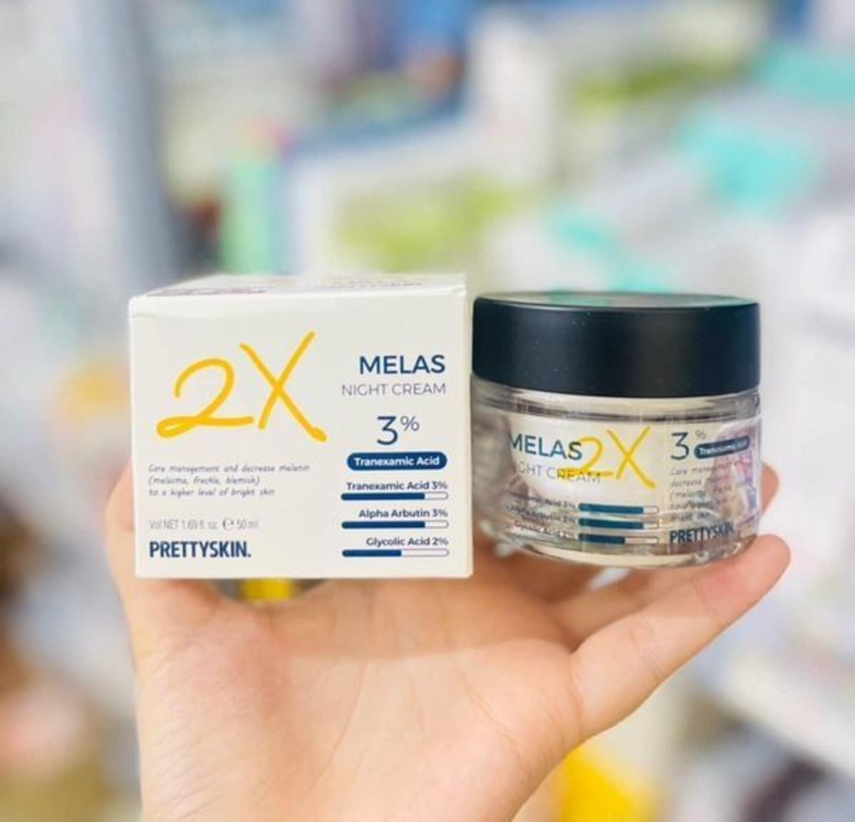 Kem dưỡng Pretty Skin Melas 2X giúp làm sáng da, mờ thâm và đều màu da hiệu quả.