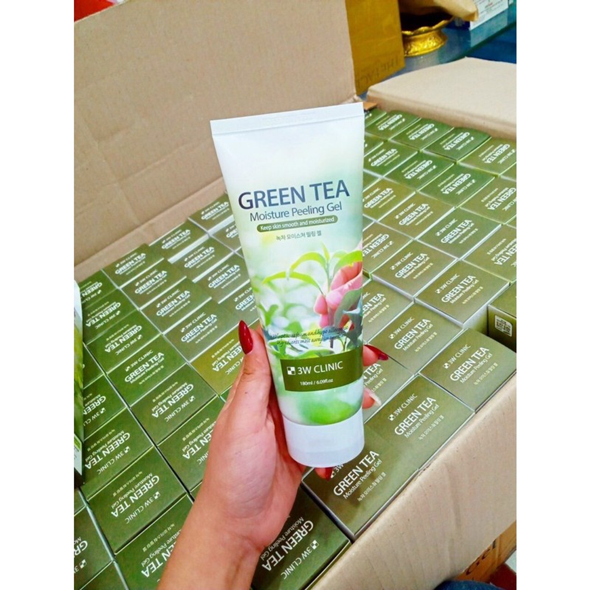 3W Clinic Green Tea Exfoliating Gel 180ml 🌱 giúp loại bỏ tế bào chết, dầu thừa và bụi bẩn, đồng thời dưỡng ẩm và làm dịu da.