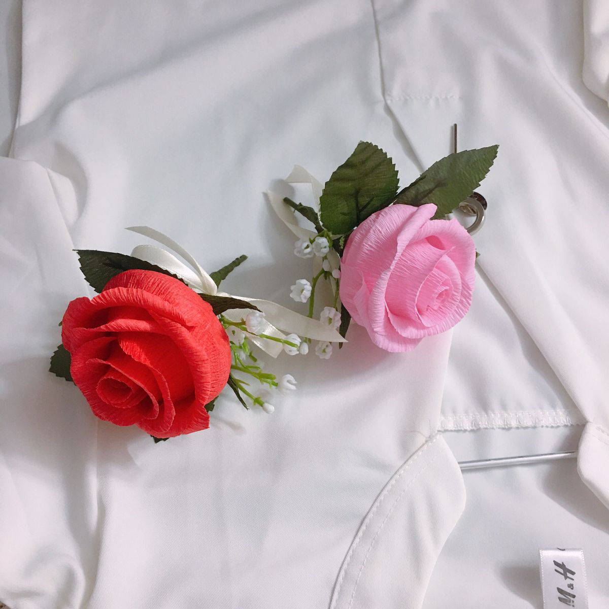 Bông hoa hồng cài áo bằng giấy nhún ý, kèm 1 lá hồng và 1 cành cúc tana tắng nhỏ xinh
