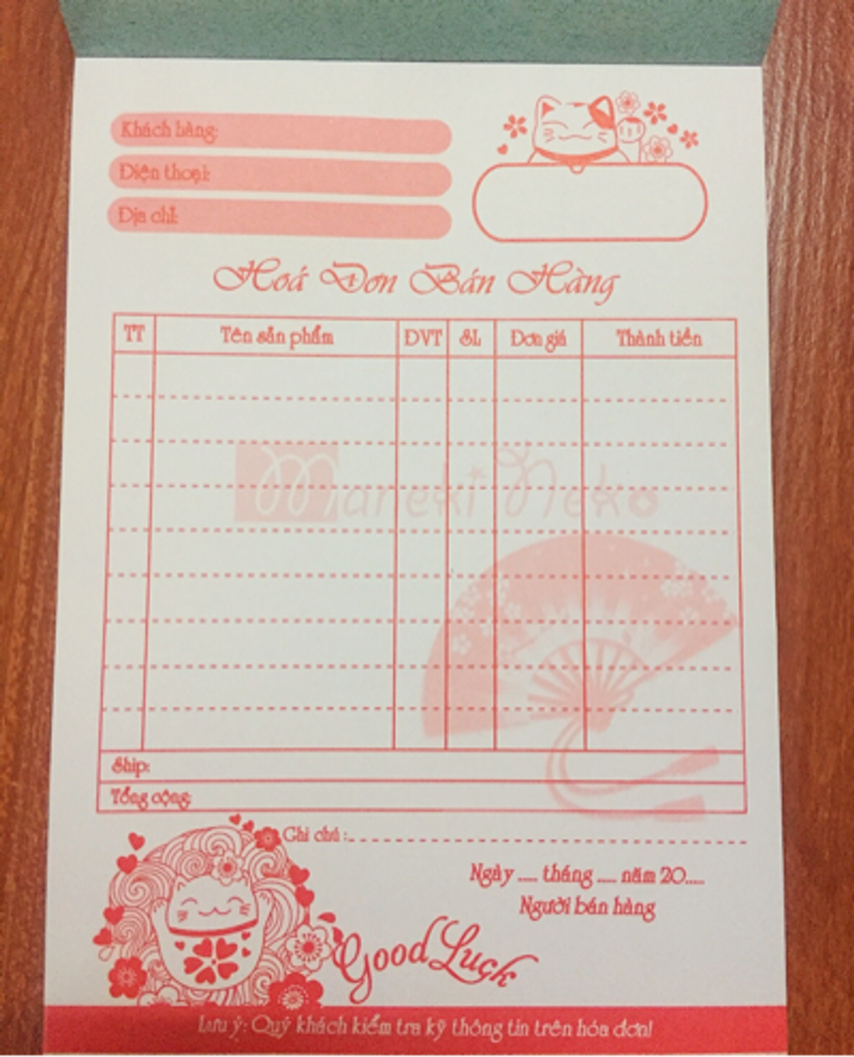 Hoá đơn 1 liên khổ a5 mèo thần tài Quy cách: 100 tờ/q In ofset siêu nét Giá sỉ: 50q : 7.000₫/q 100q: 6.500₫/q