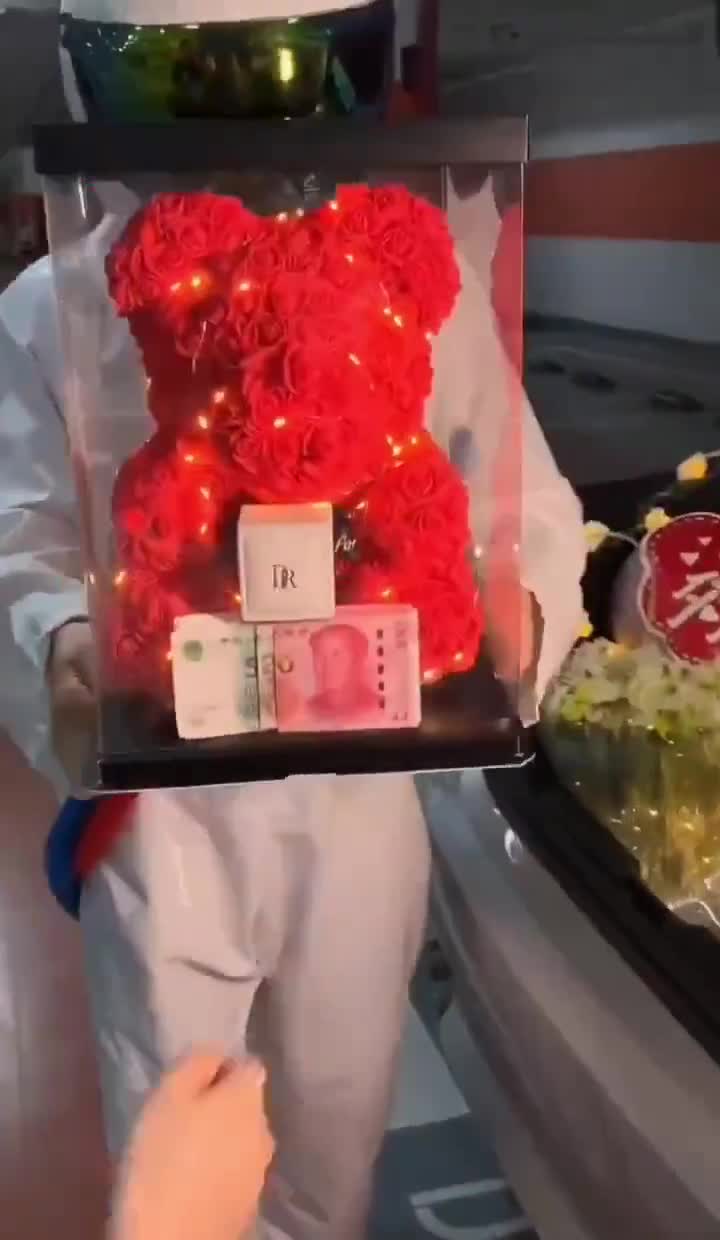 Hộp mica đựng gấu có lớp màng bảo vệ bên ngoài để chống xước,khi dùng các bạn bóc lớp màng đó ra để hộp được trong suốt nhé!