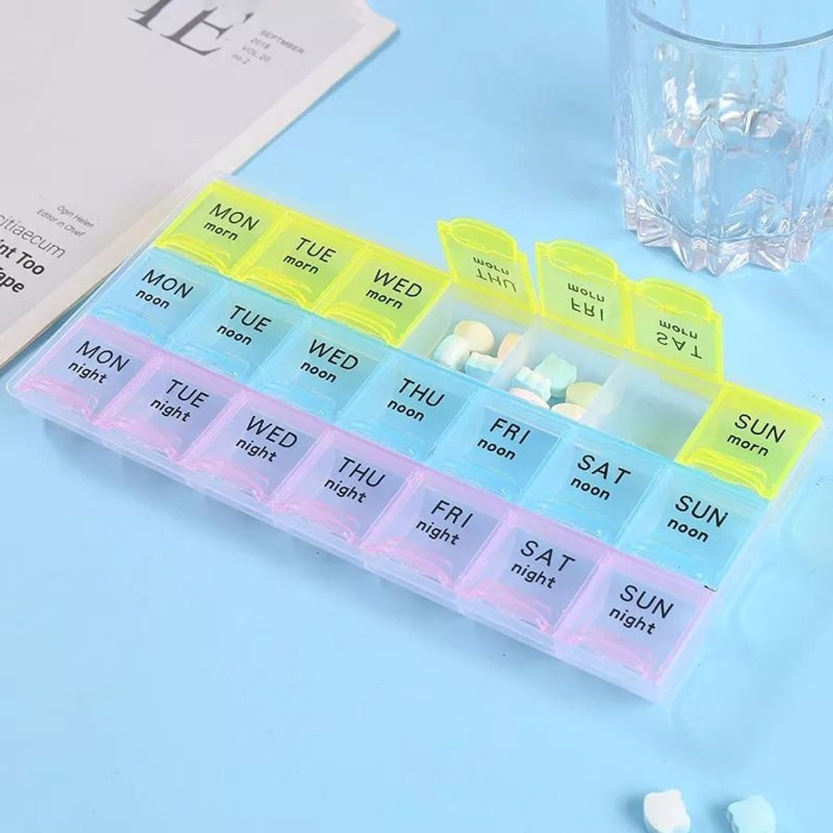 – Hộp chia thuốc 7 ngày được chia thành 21 ngăn nhỏ cho từng buổi thuốc khác nhau sáng, chiều, tối, một cách khoa học, rất tiện dụng.
