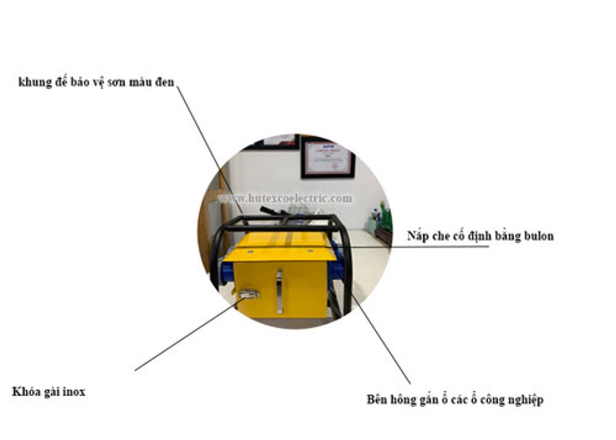 - Bên Ngoài: Vỏ hộp nguồn được thiết kế chắc chắn bằng chất liệu sắt sơn tỉnh điện. Thân hộp nguồn màu vàng có nắp che mưa được cố định bằng bulon với khung chính, Mặt Trước được thiết kế 2 lớp cửa gồm 1 lớp cửa chính có quai nắm và 1 cửa phụ che thiết bị đóng cắt nguồn điện, bên hông hộp nguồn thiết kế với 4 ngỏ ra ổ cắm công nghiệp( tuy yêu cầu của khách hàng mà được lắp các thiết bị khác nhau). Mặt sau có khoắc lổ PG dây nguồn vào, xung quanh có khung sắt bảo vệ thân máy.