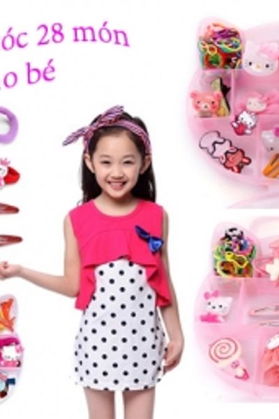 Hộp phụ kiện gồm 28 món kẹp tóc, gắp tóc đủ loại, cột tóc to và nhỏ mang nhiều họa tiết ngộ nghĩnh cho bé dễ phối cùng trang phục.
