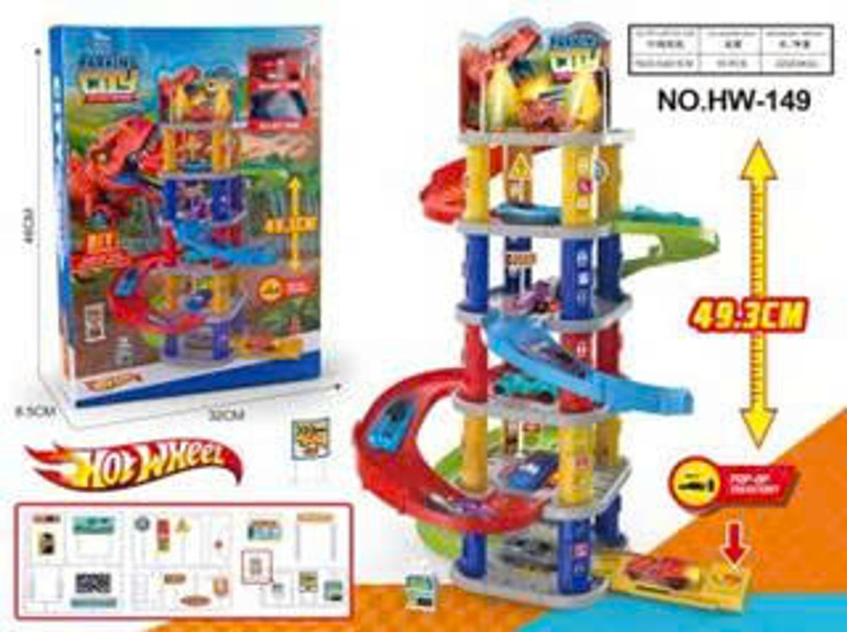 Thiết kế tháp cao nhiều tầng độc đáo, cho xe lao xuống cực nhanh, tạo cảm giác hồi hộp và thích thú cho bé. Bộ đồ chơi đi kèm xe mini và các chi tiết lắp ráp chắc chắn, giúp bé dễ dàng tạo nên đường đua riêng.