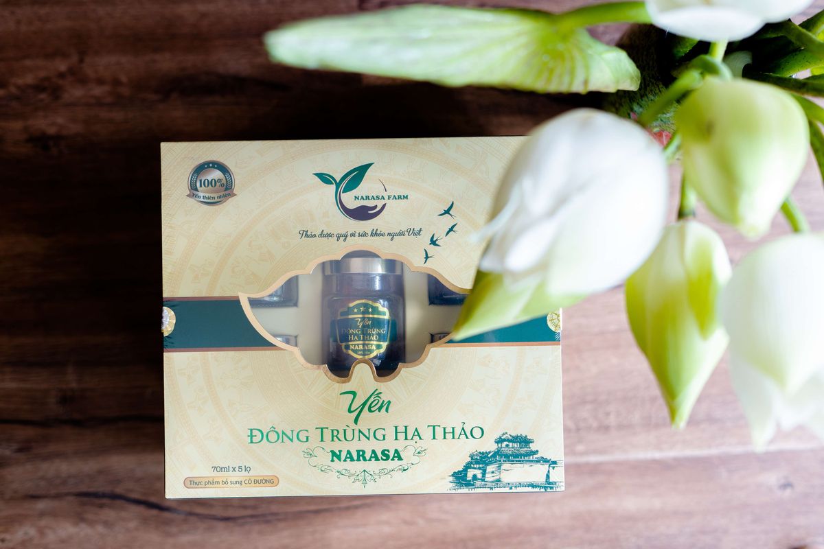 Mô tả sản phẩm: Yến Đông trùng hạ thảo Narasa là loại sản phẩm được tạo nên từ hai loại dược liệu vô cùng quý giá: Đông trùng hạ thảo và Tổ yến. Đây đều là những thứ có giá trị dinh dưỡng cực kỳ cao giúp bồi dưỡng sức khỏe, đẹp da, chống lão hóa, tăng cường sức lực và là quà tặng cao cấp.