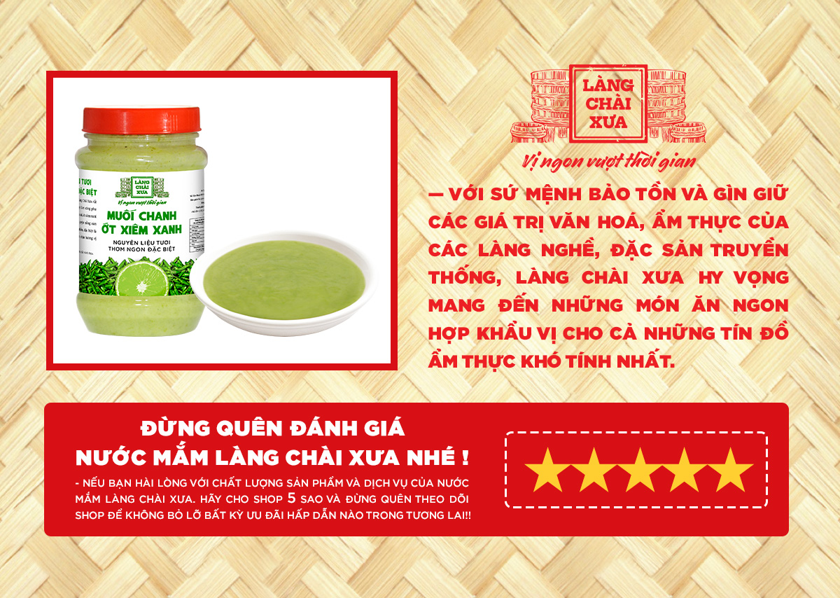 Trải nghiệm sự hòa quyện tinh tế giữa vị chua thanh của chanh tươi, vị cay nồng đặc trưng của ớt xiêm xanh và sự đậm đà từ muối tinh khiết. Sản phẩm được chế biến công phu, giúp nâng tầm hương vị cho mọi món ăn, đặc biệt là hải sản và đồ nướng.