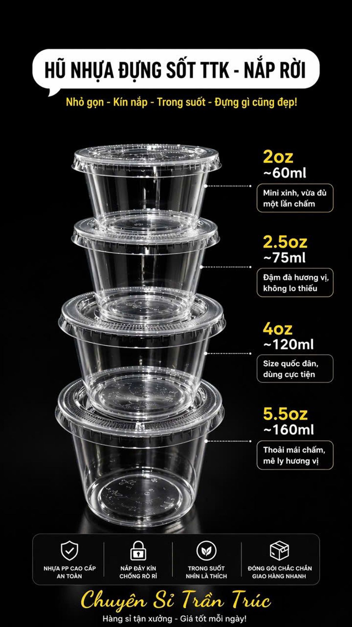 Các size 2oz đến 5.5oz là các kích thước phổ biến được nhà sản xuất cung cấp trong cùng dòng hũ sốt chuyên dụng.
