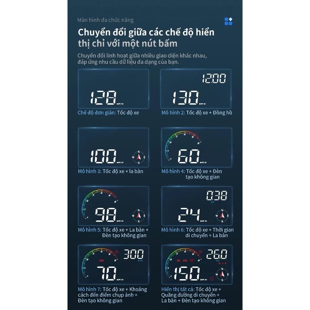 • Chế độ làm việc: OBD2 mode/GPS mode (tự chọn) – tương thích hầu hết xe đời hỗ trợ OBD2; nếu xe không hỗ trợ OBD, bật GPS để hiển thị tốc độ.
