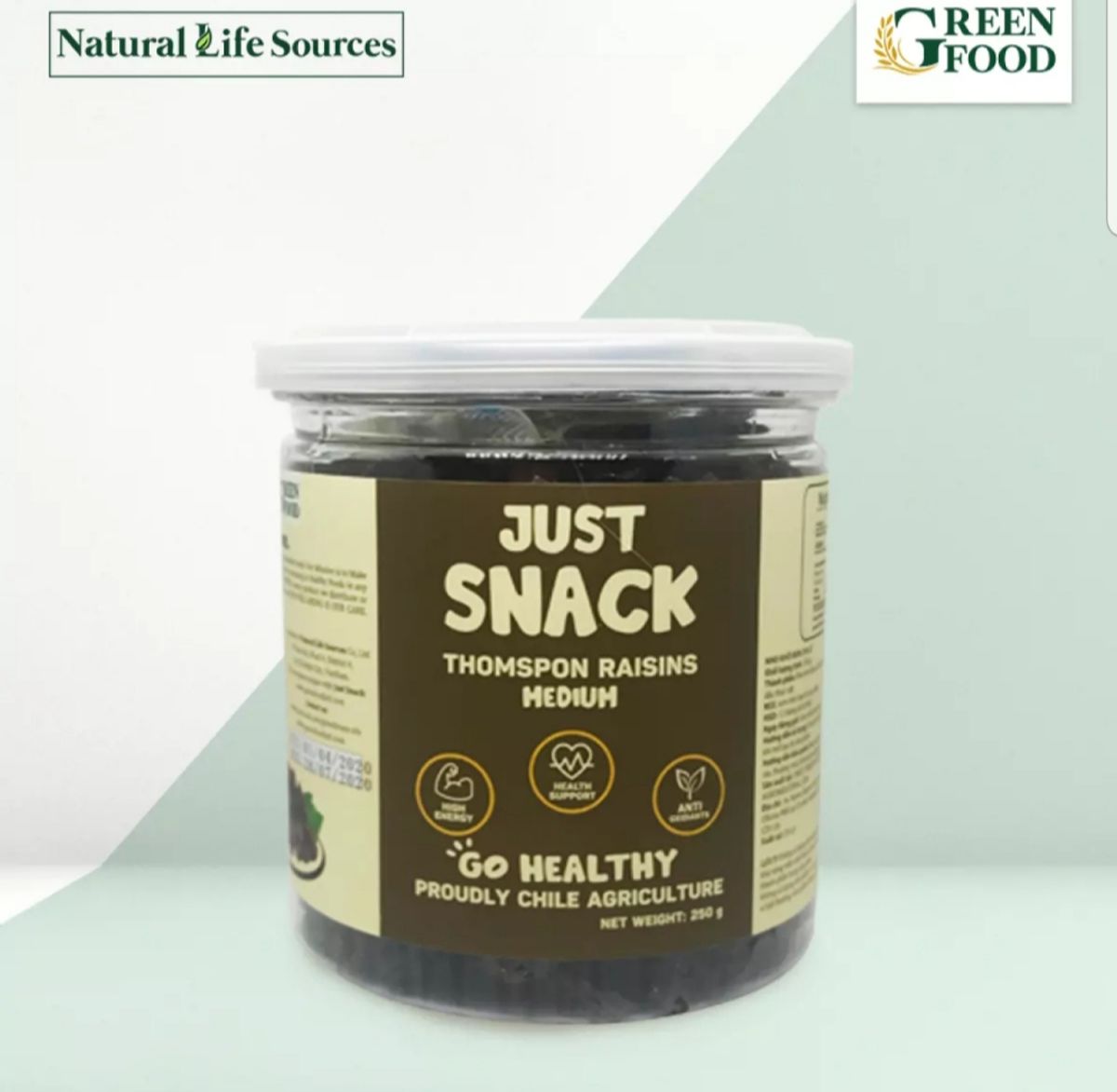 Nho khô đen Chile Just Snack kích cỡ medium hộp 250g, giàu chất xơ, giúp bổ sung chất sắt cho cơ thể.