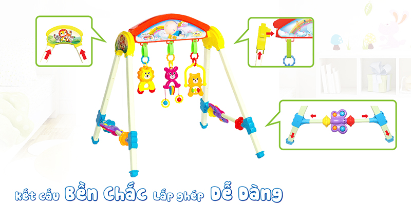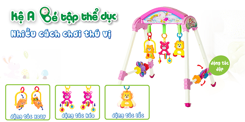 Ba xúc xắc treo ngộ nghĩnh được treo vừa tầm với của bé, mỗi bạn có 1 cách chơi và đặc điểm khác nhau: Bạn Cáo màu cam với khả năng " lộn vòng" và phát ra âm thanh xúc xắc vui tai do các hạt vòng va đập vào nhau. Bạn sư tử màu vàng có chiếc bờm quanh đầu màu cam là chiếc xúc xắc chuông cầm lắc. Bạn thỏ hồng kéo dây hai bên phát ra âm thanh của xúc xắc , Ngoài ra 2 khung ngang còn được treo thêm xúc xắc hình 1 chú bướm và những bông hoa có thể xoay tròn khi bé đập tay vào.