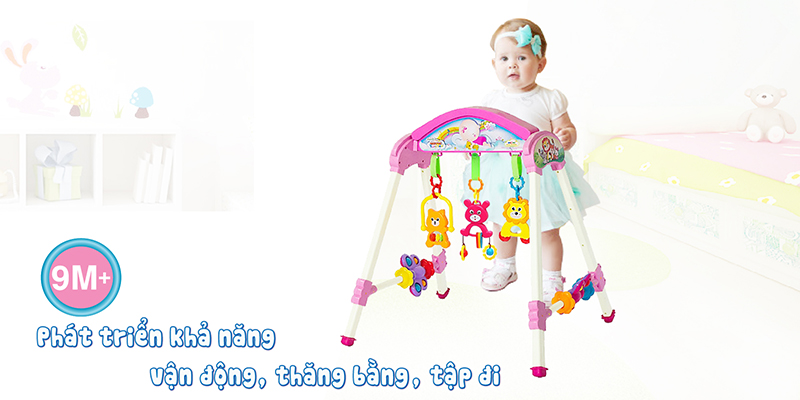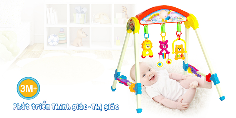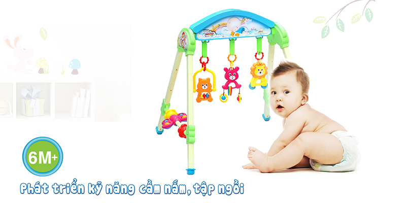 Bé từ 6 tháng tuổi trở lên: Ở giai đoạn này bé đang bắt đầu tập ngồi, bố mẹ sẽ cho bé vừa chơi lúc nằm vừa chơi lúc ngồi. Lúc nằm, bé sẽ chơi giống như giai đoạn 3 tháng tuổi. Khi bé có thể tự ngồi chơi và thao tác với từng món xúc xắc bé sẽ thích thú hơn khi đập tay vào các xúc xắc và đồ chơi xoay 360 độ ở thanh ngang phía dưới để các xúc xắc phát ra các âm thanh, Mỗi xúc xắc có âm thanh khác nhau, vừa phải, phù hợp với thính giác của bé, giúp bé nhận biết được nhiều loại âm thanh. Trong quá trình chơi, các giác quan như thính giác, xúc giác, khả năng cầm nắm, sự phối hợp giữa tay và mắt dần được hoàn thiện và phát triển.