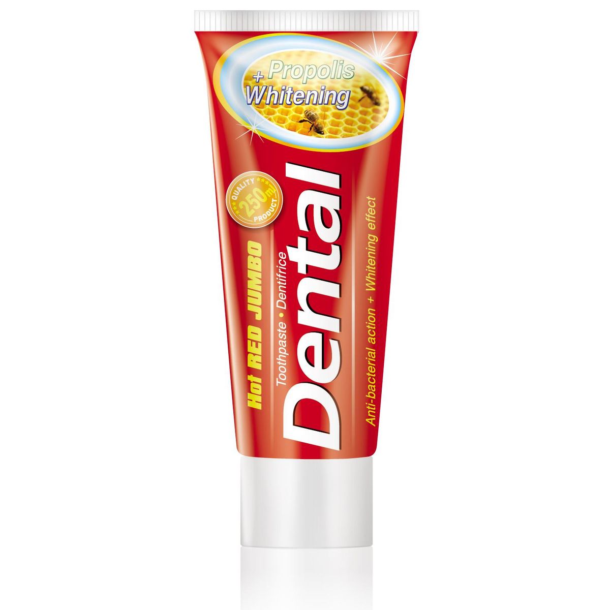 Kem đánh răng Dental Hot Red JUMBO Propolis Whitening-250ml là kem đánh răng mật ong kháng khuẩn và ngăn ngừa sâu răng mạnh mẽ , cũng như hỗ trợ chữa lành , giảm đau nướu dành cho răng ê răng buốt .