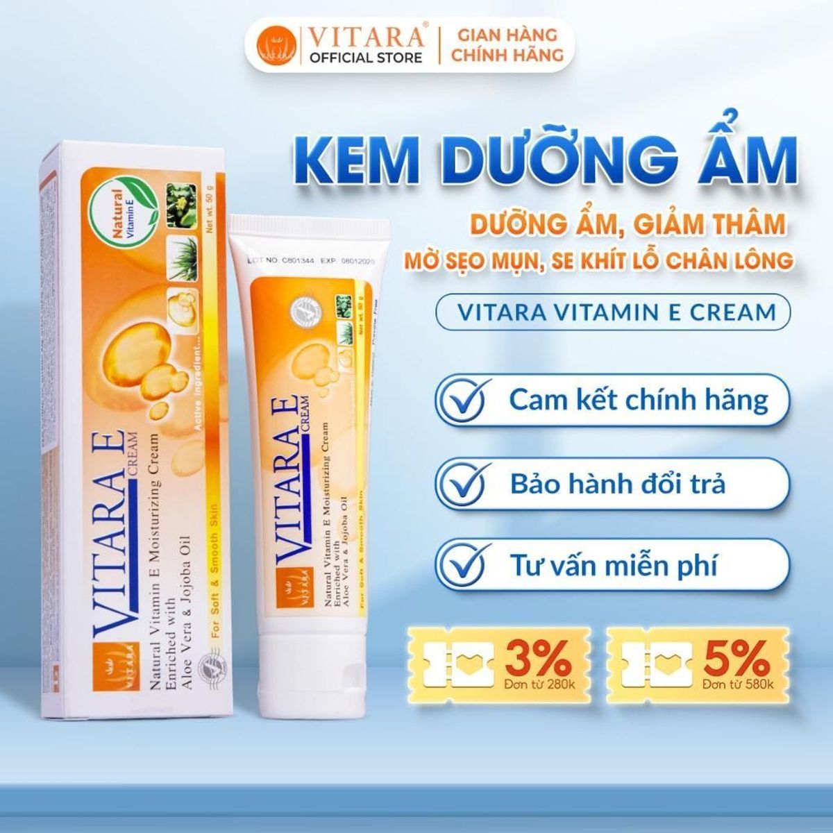 Kem dưỡng ẩm VITARA – E CREAM có xuất xứ từ Thái Lan giàu vitamin E tự nhiên với nha đam và dầu Jojoba giúp làm da mềm và mịn giảm khô và nhăn da, ngăn ngừa rạn da sau khi mang thai hoặc da bị sẹo.