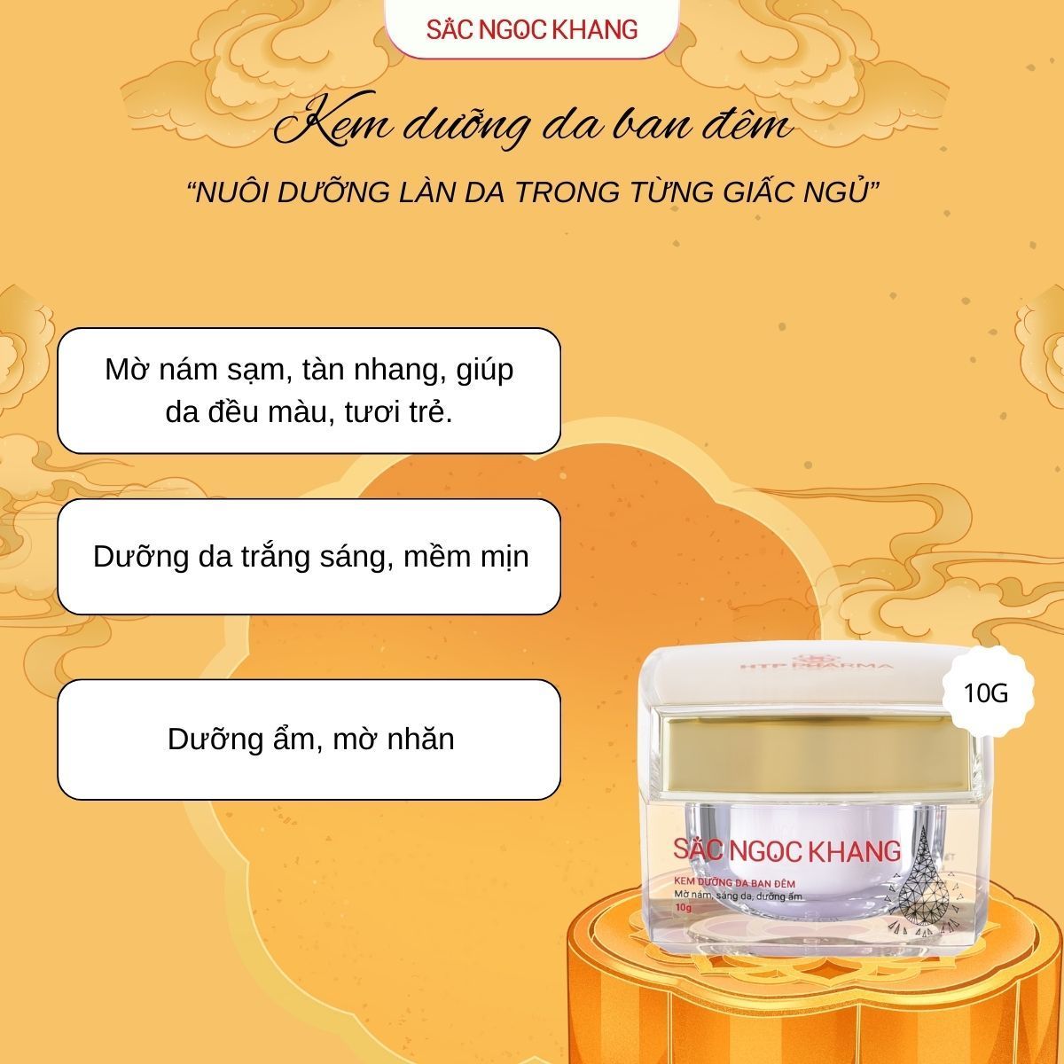 Ngoài ra, điểm cộng thêm cho Kem Dưỡng Ban Đêm Sắc Ngọc Khang là kết cấu gel mát lạnh, có khả năng thẩm thấu nhanh và tan ngay tức thì trên da, kết hợp với hương thơm nhẹ nhàng, cho bạn cảm giác đầy thư thái.