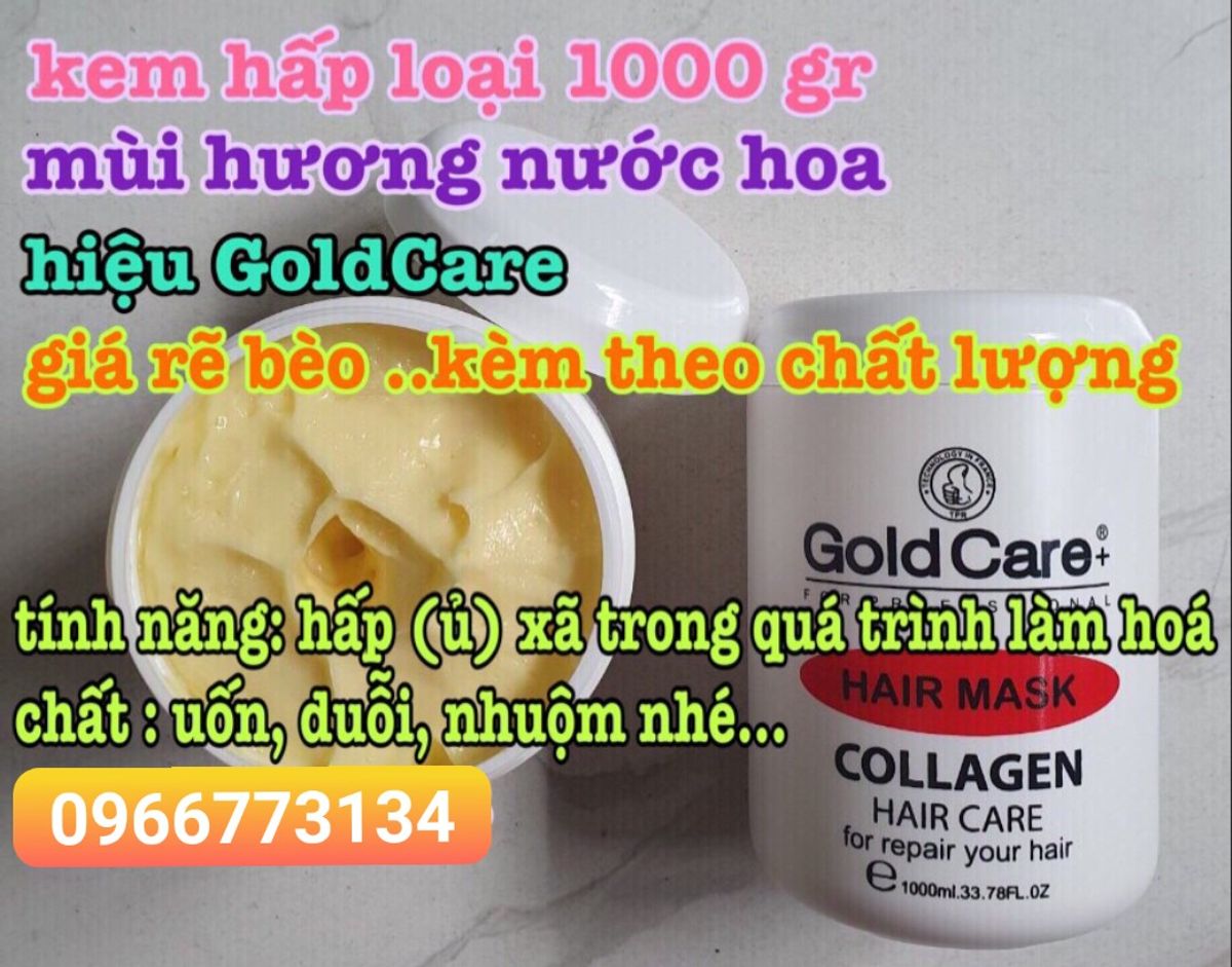 kem hấp bóng mềm mượt, giá rẽ như bèo, loại 1000gr, với mùi hương nước hoa, tính năng dùng cho hấp (ủ) xã, trong quá trình làm hóa chất, loại 1000gr hiệu Goldcare.