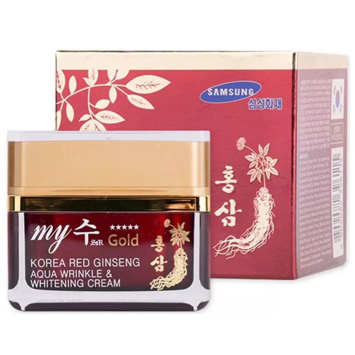 Kem Hồng Sâm AQUA WRINKLE&WHITENING MYSU - My Gold Korea 50mLKem sâm dưỡng da tổng hợp ngày và đêm là dòng sản phẩm mới của kem sâm. Được tinh chế phù hợp để có thể dùng được cho cả ngày và đêm, bạn chỉ cần 01 hộp kem tổng hợp thay vì 02 hộp riêng biệt cho ngày và đêm.Công dụng: