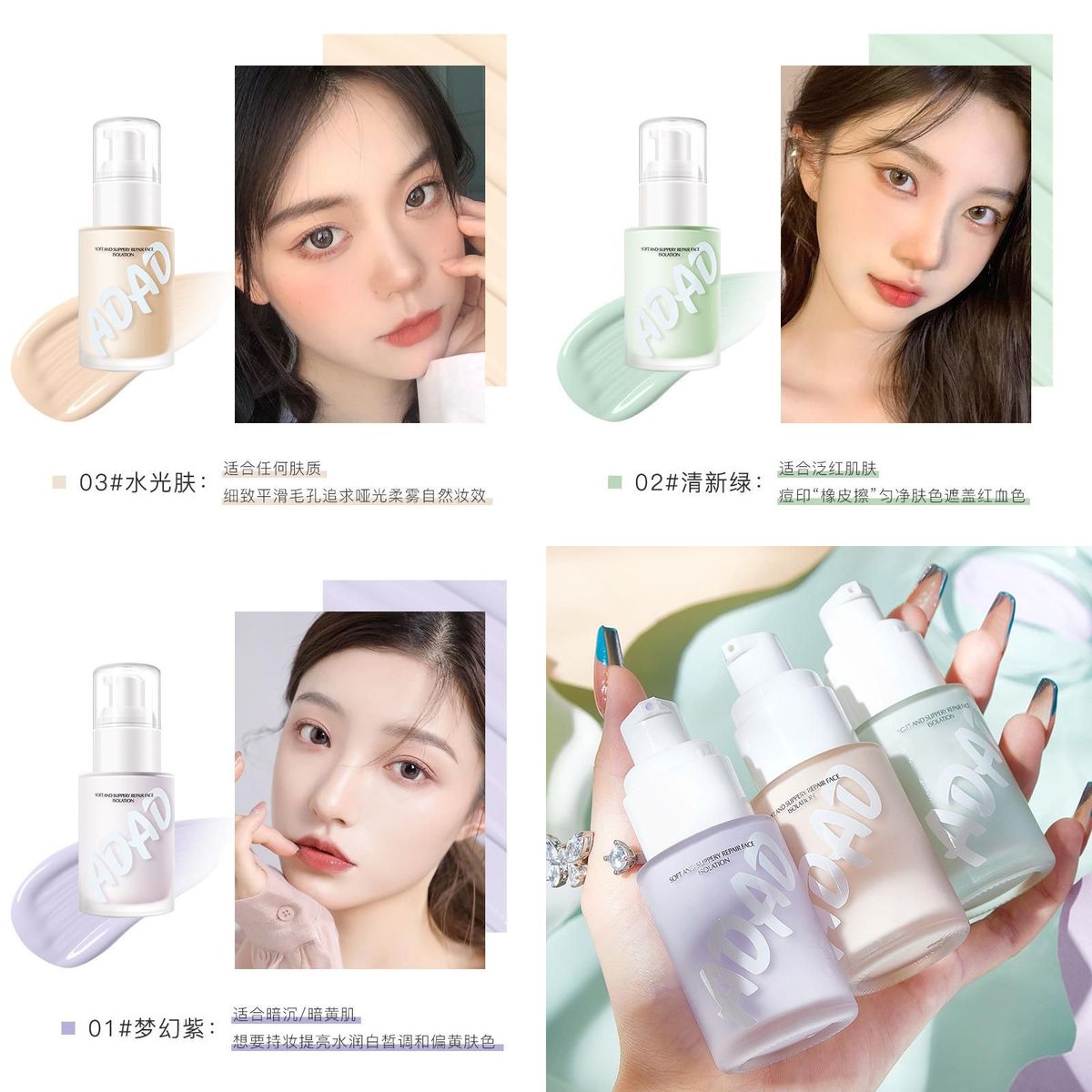 Kem Lót Trang Điểm ADAD Hiệu Chỉnh Màu Da 30g – 3 Tone Tím, Xanh, Be, Che Khuyết Điểm, Giữ Nền Lâu Trôi