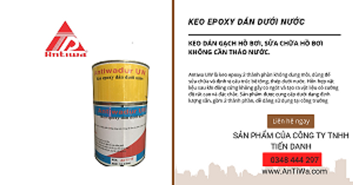 Antiwa UW là keo epoxy 2 thành phần không dung môi, dùng để sửa chữa dán gạch trực tiếp dưới nước và định vị cấu trúc bê tông, thép dưới nước. Hỗn hợp vật liệu sau khi đông cứng không gây co ngót và tạo ra vật liệu có cường độ rất cao và đặc chắc. Sản phẩm được cung cấp dưới dạng định lượng sẵn, gồm 2 thành phần, dễ dàng sử dụng tại công trường. Antiwa UW thích hợp cho việc thi công bằng cách trám hay dán. Sản phẩm đặc biệt thi công và đóng rắn và bám dính chắc chắn ngay trong môi trường ngập nước.