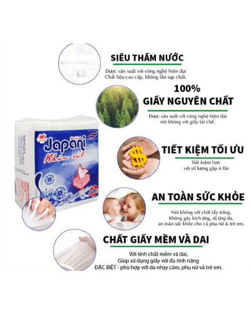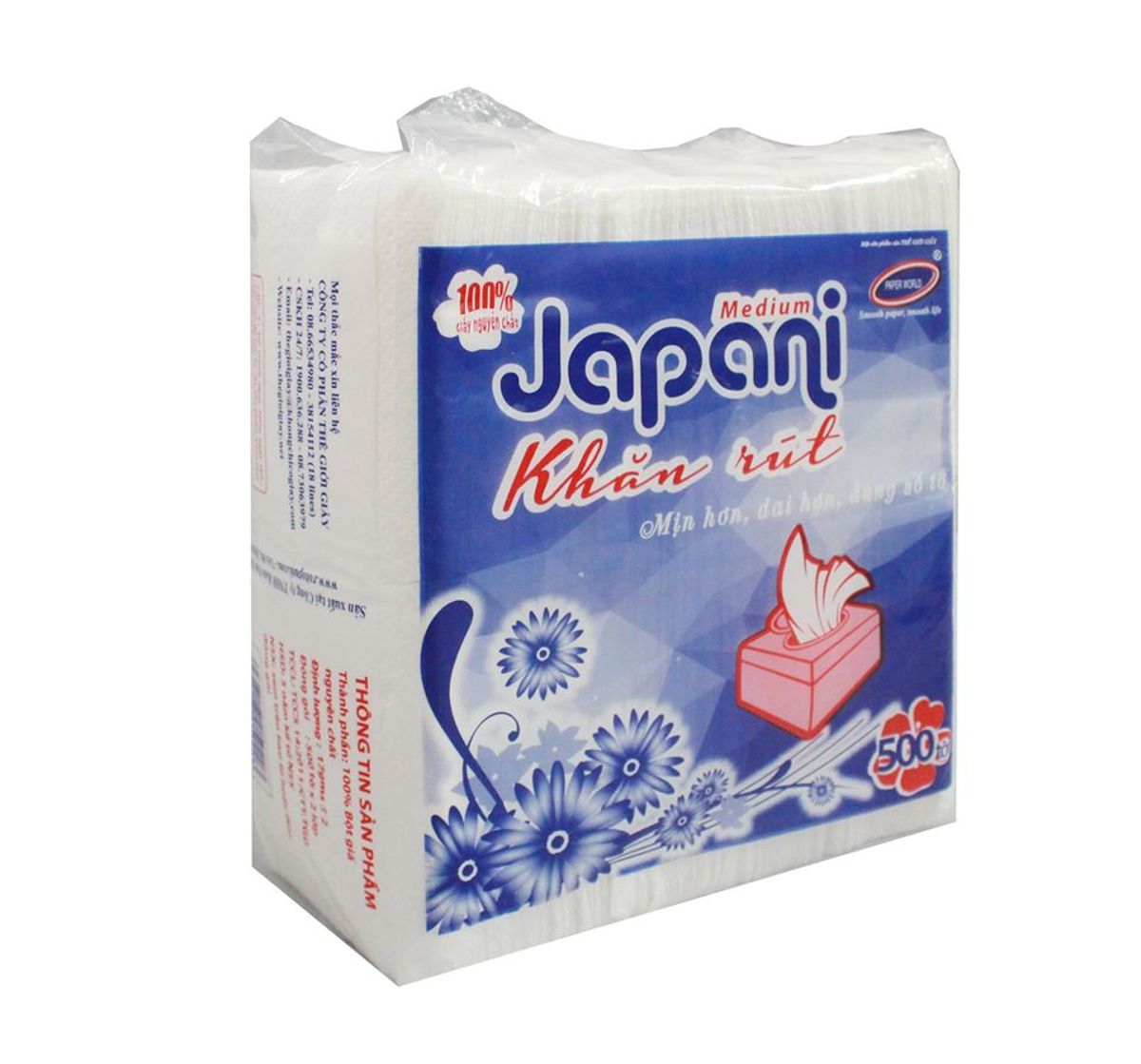 Khăn giấy rút japani không những là một nhu yếu phẩm dừng cho các hàng quán ăn, quán cà phê, quán nhậu,....Giấy được làm theo tiêu chuẩn của Nhật Bản với quy trình khép kín. được làm từ 100% bột giấy nguyên chất an toàn, bảo vệ sức khỏe cho nhà nhà, người người sử dụng.