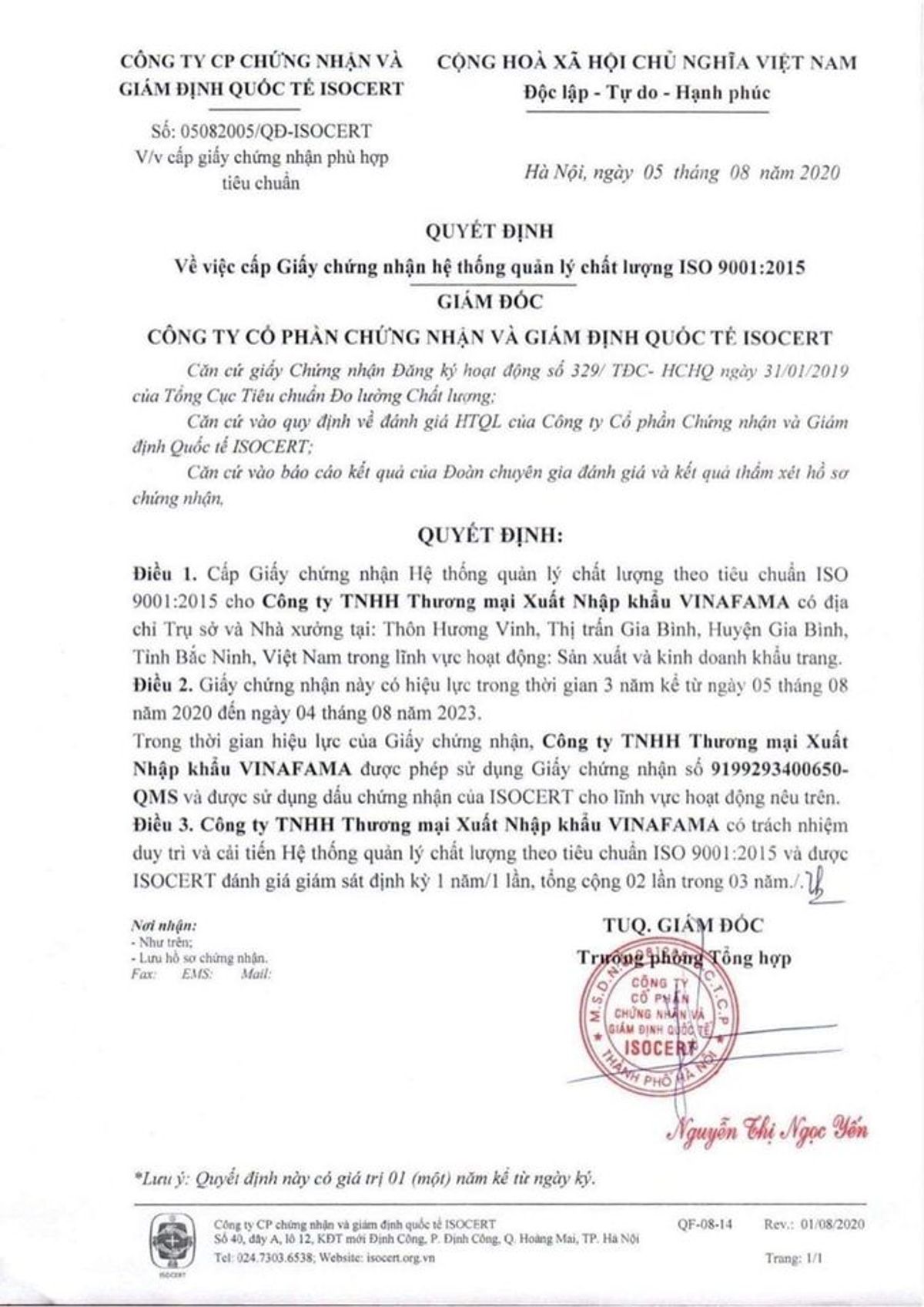 Khẩu trang y tế 4 lớp kháng khuẩn FACE MASK VINAFAMA Anti - fog được sản xuất từ nguyên liệu vải không dệt và màng lọc kháng khuẩn đạt chuẩn Meet Current ISO 9001:2015 ISO 13485:2016