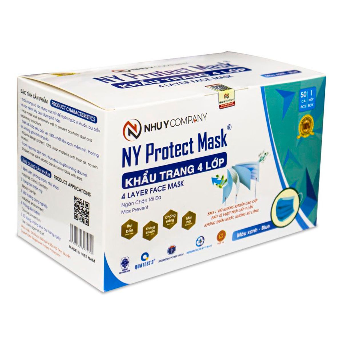 Sản phẩm khẩu trang y tế 4 lớp do Công ty Như Ý sản xuất có in hình logo chính hãng trên góc phải của khẩu trang.