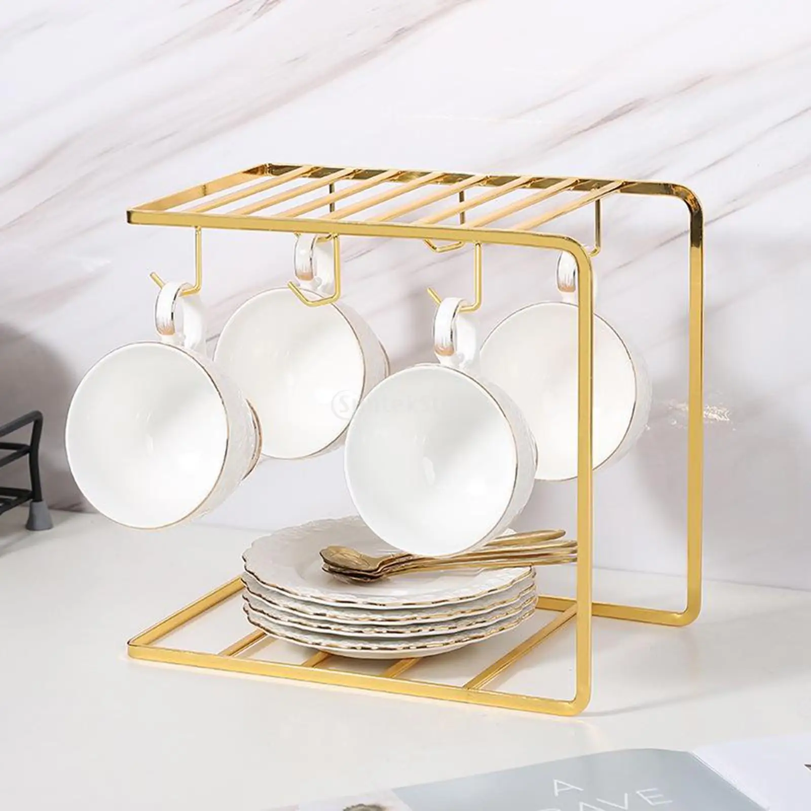 Mô tả: Khay đựng cốc nước hình vuông kèm giá đỡ trắng khung kim loai mạ vàng Giá úp cốc sang trọng đẹp có đế hứng nước