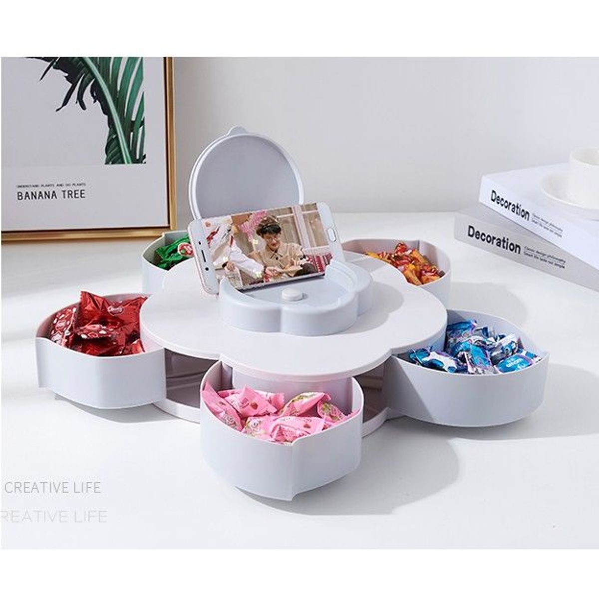 Khay đựng mứt xoay 5 cánh có giá để điện thoại. kick thước đường kính 28cm. cao 8.5cm.