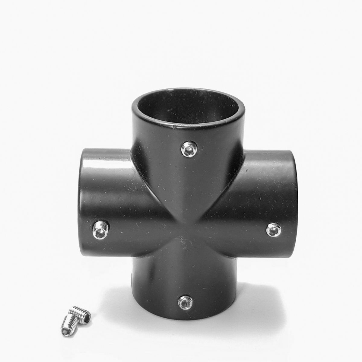 Khớp nối ống KN119-25 dùng để lắp ghép dấu cộng giữa hai ống thép hai bên và một ống thép đứng xuyên qua ở giữa.