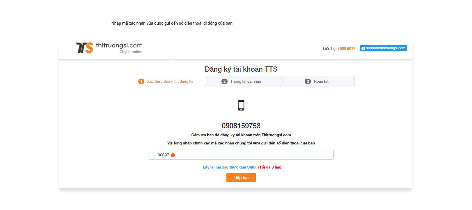 Bước 3: Tiếp theo, Thitruongsi.com sẽ gửi về cho bạn 1 mã số xác thực số điện thoại thông qua tin nhắn SMS.