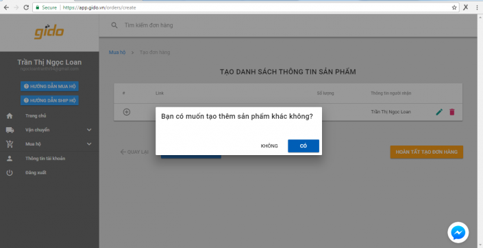 Hệ thống báo giá Gido chỉ cho phép 1 đường link sản phẩm/đơn hàng. Nếu bạn mua nhiều sản phẩm ở những đường link khác nhau thì bạn có thể chọn “CÓ” tạo thêm sản phẩm, đơn hàng mới. Để kết thúc các bước tạo đơn hàng và hệ thống cập nhật, bạn chọn “HOÀN TẤT TẠO ĐƠN HÀNG”.
