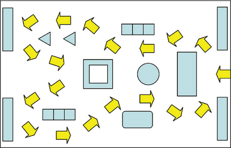 Bạn cần phải đảm bảo lối đi của cửa hàng đủ rộng để khách có thể thoải mái xem hàng và không va chạm vào những người khác. Không những vậy, sơ đồ lối đi cũng nên dựa vào giới tính của đối tượng khách hàng để xác định. Thông thường, đàn ông thường thích mua hàng ở những cửa hàng có lối đi thẳng bởi vì nó giúp họ tiết kiệm thời gian di chuyển và tìm kiếm sản phẩm trong cửa hàng. Trong khi đó phụ nữ lại thích những lối đi quanh co để họ nhìn thấy được nhiều sản phẩm và dễ dàng so sánh chúng với nhau.