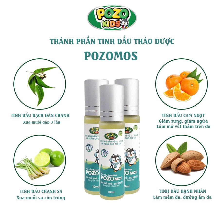 Lăn đuổi muỗi và côn trùng tinh dầu thảo dược PozoMos 10ml chứa tinh dầu tự nhiên có tác dụng xua đuổi các loại côn trùng, bọ chét, bọ ve, muỗi, rệp... không gây dị ứng cho da, thích hợp sử dụng cho bé từ sơ sinh và người lớn.