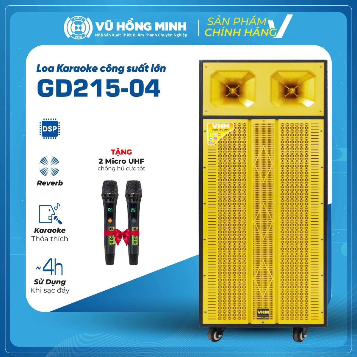 Loa karaoke di động VHM 215-04 Plus mang thiết kế mạnh mẽ, công suất 200W cho âm thanh ổn định và lan tỏa tốt trong không gian rộng. Hệ thống âm thanh gồm bass 4 tấc x2 và treble 350 x2 giúp tái tạo âm trầm sâu, âm cao sáng rõ, mang đến trải nghiệm nghe sống động và trung thực. Kích thước loa 484 x 450 x 1217mm cùng trọng lượng 58kg đảm bảo sự cân đối và chắc chắn khi di chuyển, phù hợp cho các buổi hát karaoke, sự kiện ngoài trời hay trong nhà.