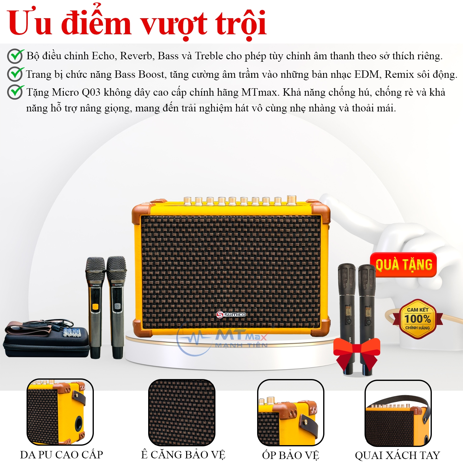Sumico không chỉ dừng lại ở việc mang đến sản phẩm tốt nhất, mà còn tặng kèm Micro Q03 không dây cao cấp chính hãng MTmax. Khả năng chống hú, chống rè và khả năng hỗ trợ nâng giọng là điểm độc đáo của micro này, mang đến trải nghiệm hát vô cùng nhẹ nhàng và thoải mái.