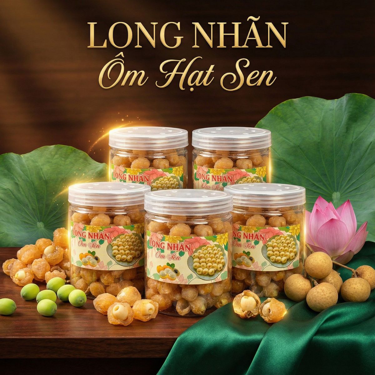 LONG NHÃN ÔM SEN - TINH HOA ĐẤT TRỜI, HÒA QUYỆN VỊ GIÁC! Bạn đã bao giờ thưởng thức sự kết hợp hoàn hảo giữa vị ngọt ngào của long nhãn và vị bùi bùi của hạt sen? Long Nhãn Ôm Sen chính là món quà độc đáo, sang trọng và đầy bất ngờ dành cho bạn!