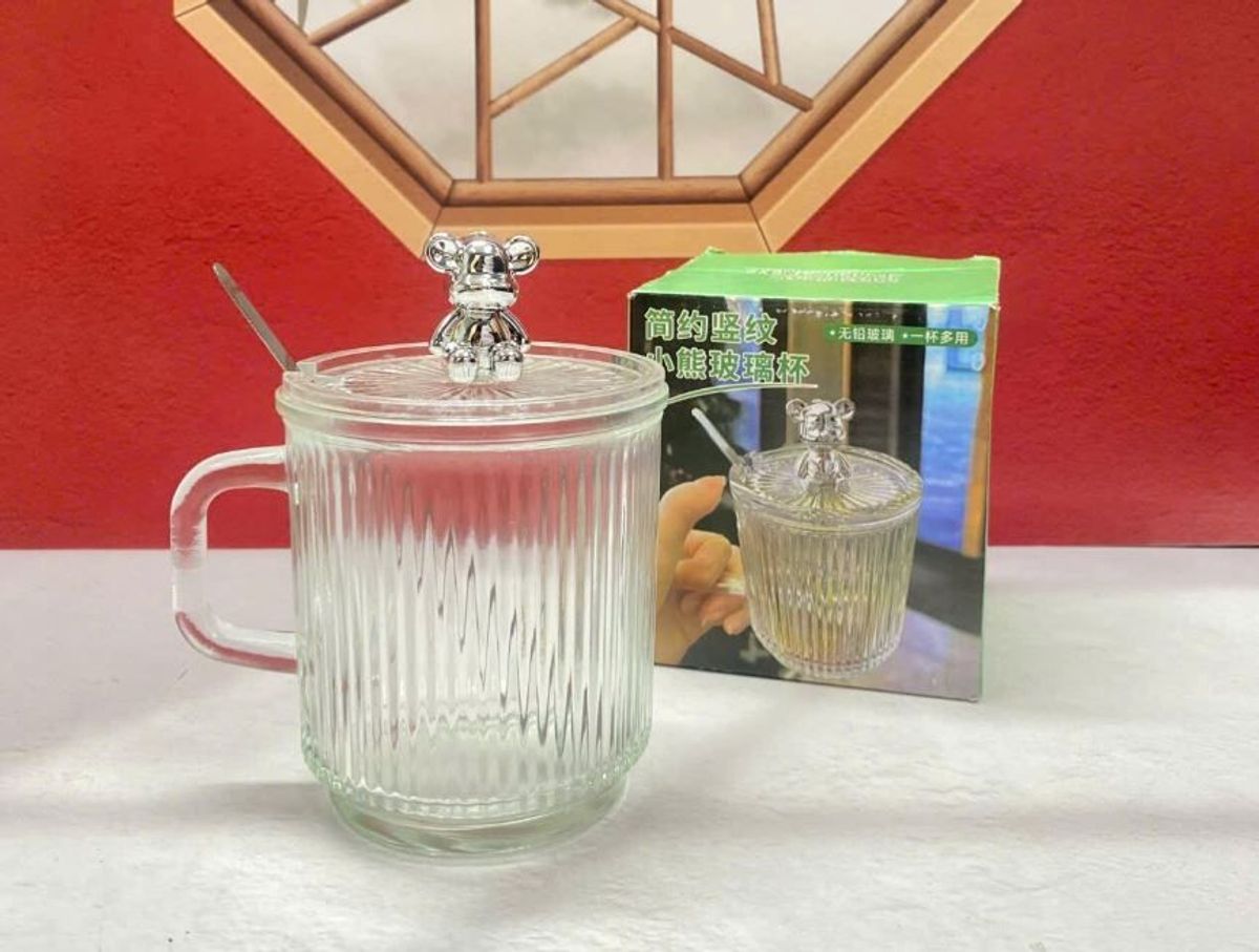 LY THỦY TINH VÂN SỌC 500ML NẮP GẤU KÈM MUỖNG (T72)