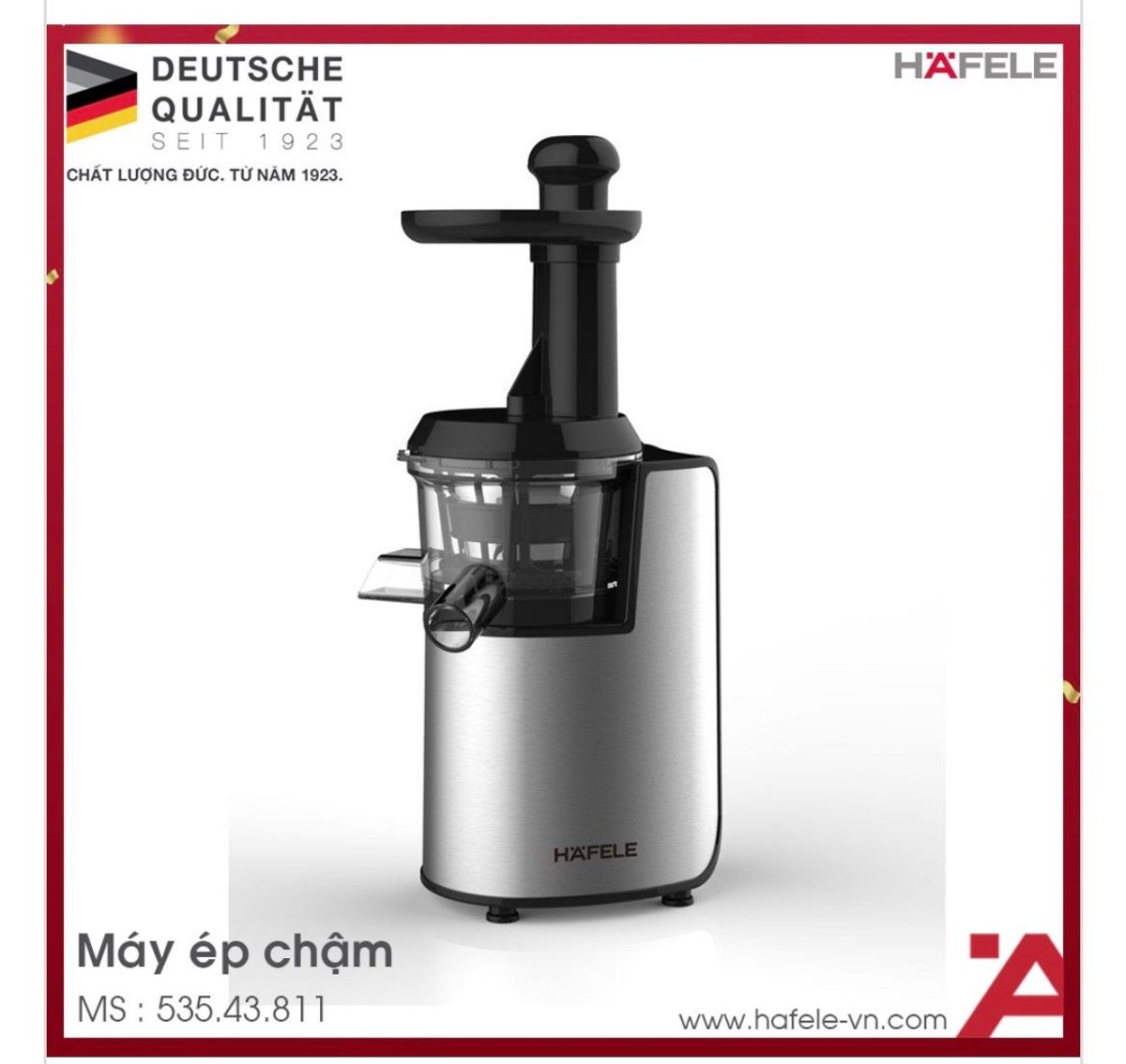 Máy ép chậm Hafele GS-133N (535.43.811)Loại máy: Máy ép chậmChức năng: Nghiền hạt ngũ cốcÉp trái cây, rau củCông suất: 200WỐng tiếp nguyên liệu: 44*25 mmSố cối: 1 cối épDung tích: Cốc đựng nước ép: 0.6 lít, Cốc đựng bã: 0.6 lítChất liệu cối: Cối ép: Thép không gỉ, NhựaChất liệu phụ kiện:Thanh nhấn: nhựaLưới lọc: nhựa, thép không gỉTrục ép: nhựa, thép không gỉCốc đựng nước ép: nhựaCốc đựng bã ép: nhựaChế độ an toàn:Tự ngắt khi quá tảiChỉ hoạt động khi cối xay được lắp đúngTiện ích:Chân đế chống trượtCó chổi vệ sinh máyKhóa vòi chống rò rỉTốc độ: 1 tốc độ, có xoay đảo chiềuChiều dài dây điện: 129 cmNút chỉnh tốc độ: Nút nhấnKích thước: Ngang 20 cm - Cao 39 cm - Sâu 11 cmThương hiệu của: ĐứcNơi sản xuất: Trung QuốcNăm ra mắt: 2018Hãng: Hafele.