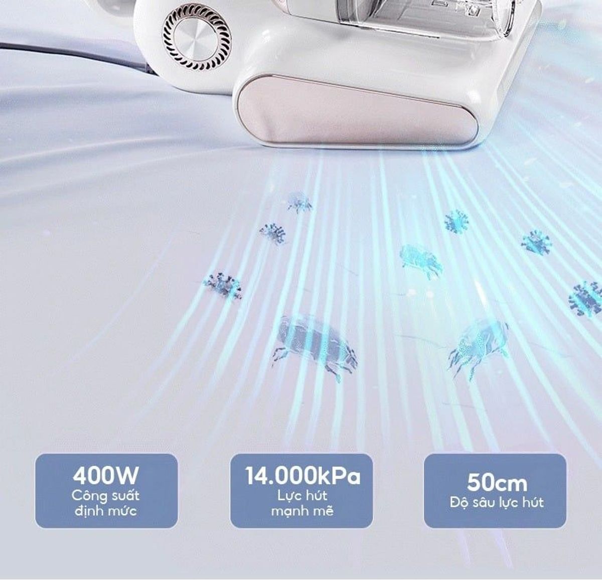 Sản phẩm được trang bị động cơ hiện đại hoạt động với công suất lớn 400W, cho lực hút lên đến 14.000Pa. Nhờ công suất cao như vậy mà máy có thể dễ dàng hút các chất gây dị ứng sâu và mạnh. Kể cả sofa hay giường nệm có độ dày cao cũng sẽ được làm sạch cặn kẽ hơn. Kết hợp cùng với tần số rung cao, máy có thể đánh bay mạt bụi, hút sạch bọ ve, lông, tóc và các chất gây dị ứng trên bề mặt gối nệm.