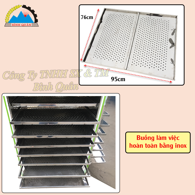 Khoang làm việc cùng 10 tầng khay sấy đựng nguyên liệu đều được thiết hoàn toàn bằng chất liệu inox cao cấp, đảm bảo vệ sinh an toàn thực phẩm. Kích thước lỗ thoát khí của khay sấy (0,7cm). Kích thước của khay sấy CD 95cm * CR 76cm.