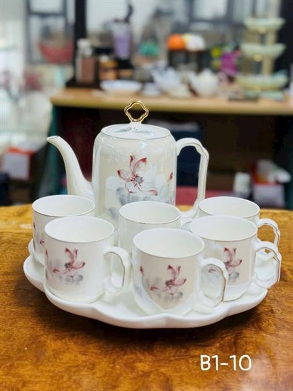 Bộ ấm chén bao gồm: 6 cốc sứ, 1 ấm sứ, 1 khay sứ