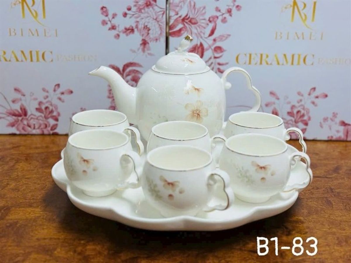 Bộ ấm chén bao gồm: 6 cốc sứ, 1 ấm sứ, 1 khay sứ