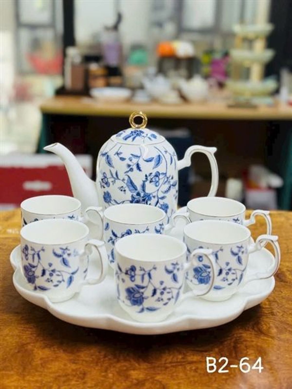 Bộ ấm chén bao gồm: 6 cốc sứ, 1 ấm sứ, 1 khay sứ