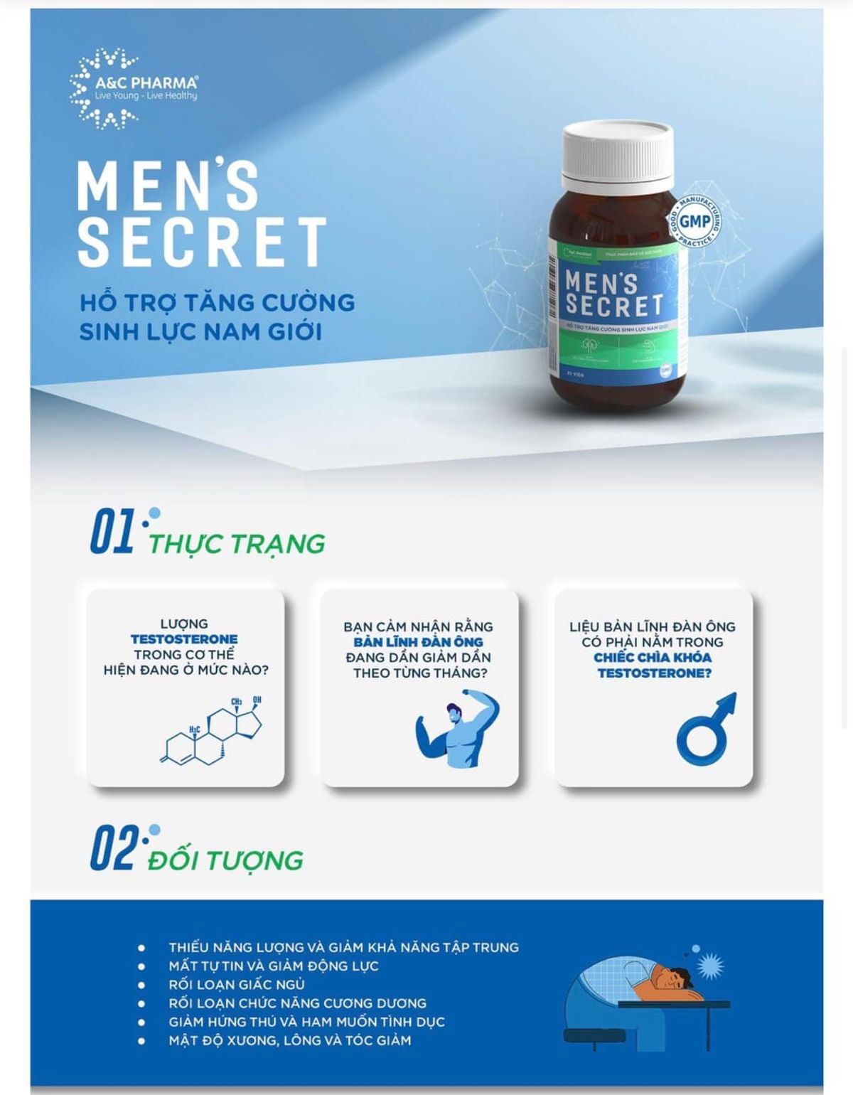 MEN'S SECRET có công dụng hỗ trợ bổ thận, tráng dương, giúp tăng cường sinh lực nam giới và cải thiện sinh lý nam. Hỗ trợ giảm các triệu chứng như: đau lưng, mỏi gối, tiểu đêm nhiều lần do thận yếu.