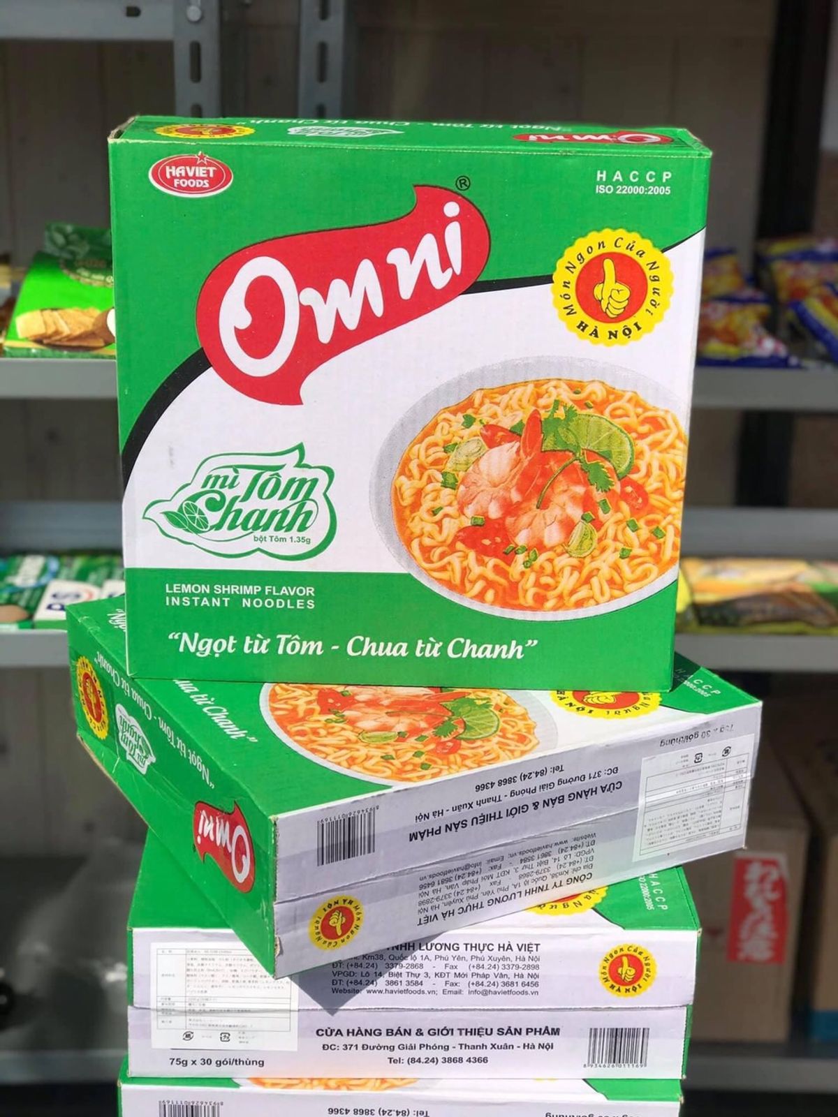 Mì Omi chanh Ăn Liền thùng 30 gói. Mì tôm chanh Omni được nhiều người tiêu dùng ưa chuộng. Sản phẩm được sản xuất trên dây chuyền công nghệ hiện đại, tiên tiến, không sử dụng các hóa chất độc hại.