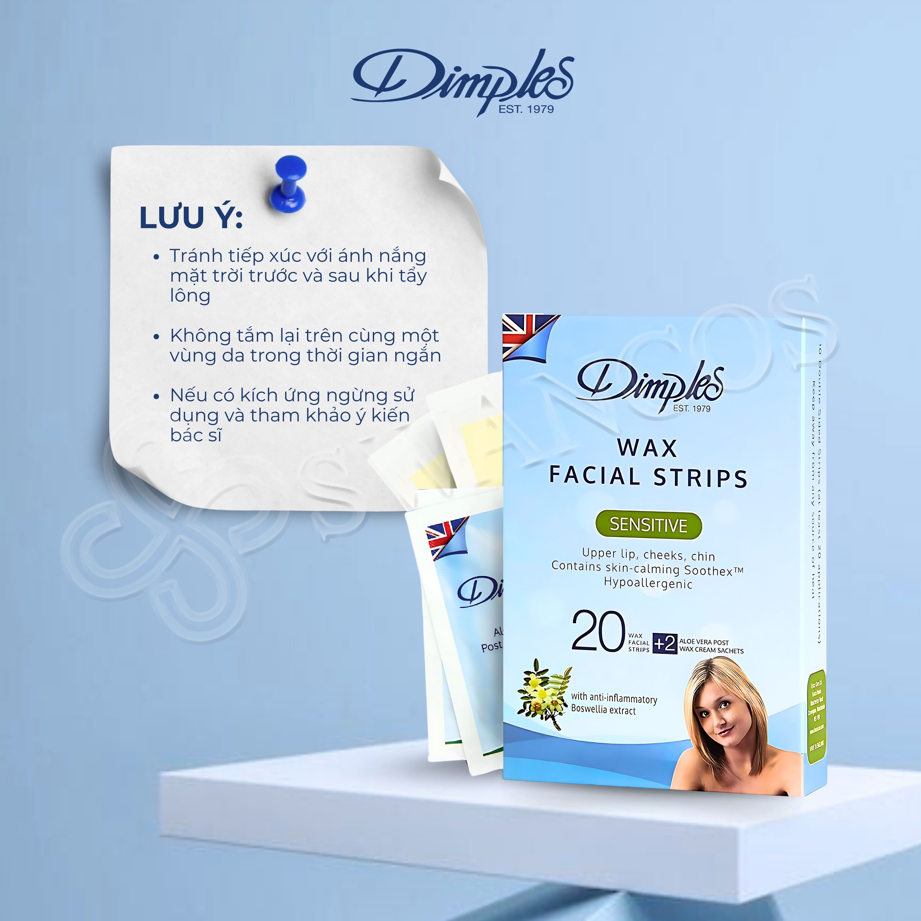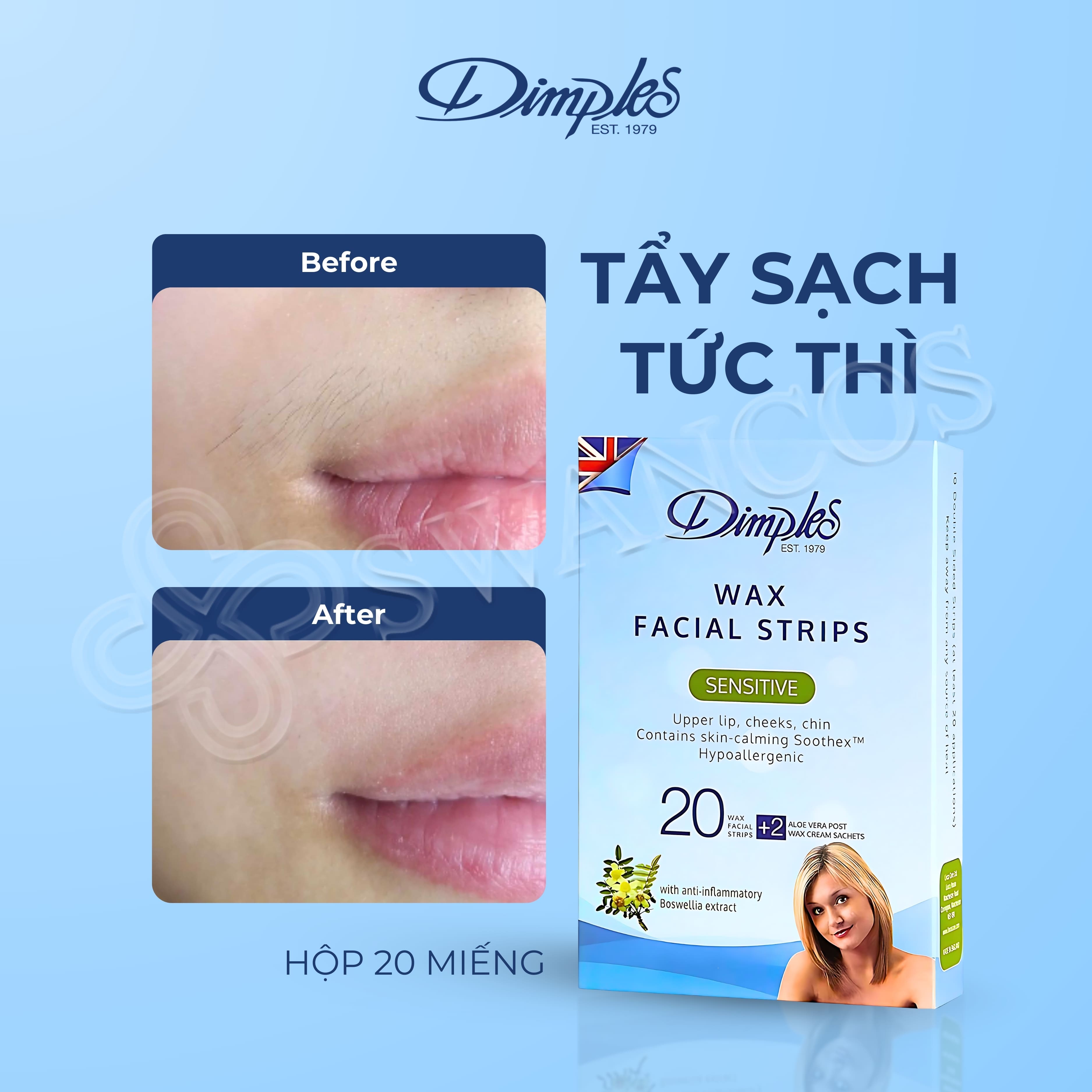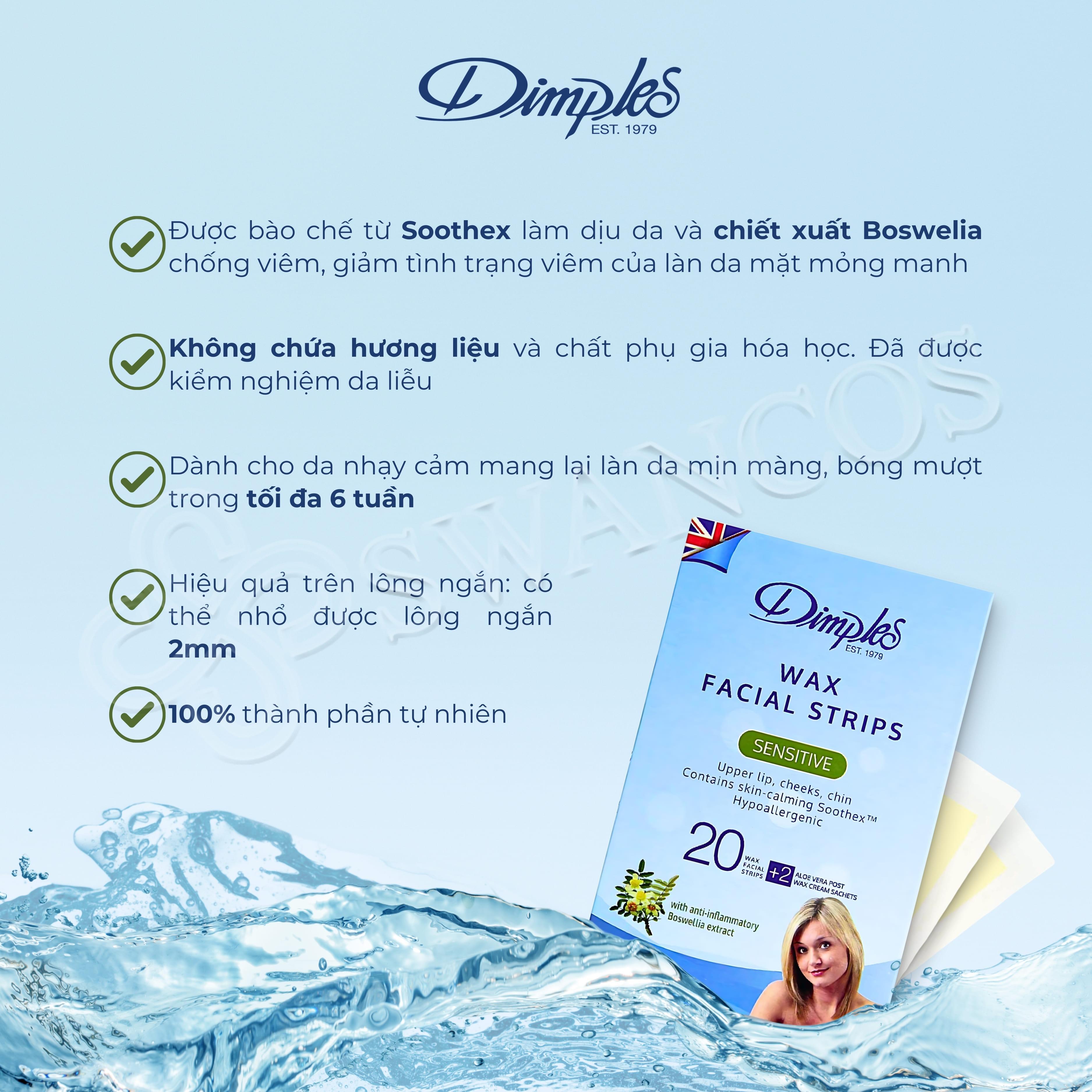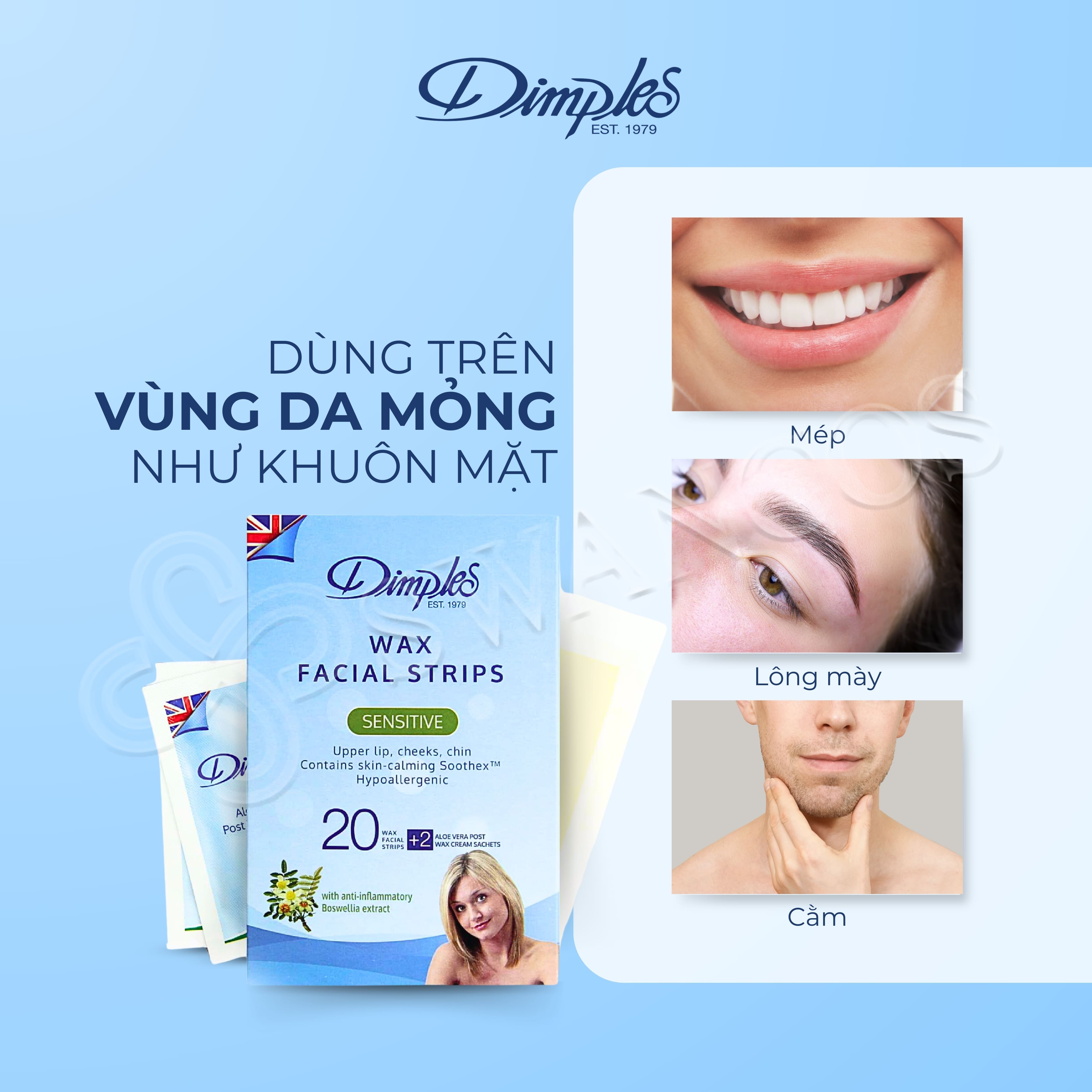 Miếng Wax Tẩy Lông Mặt Dimples – Sensitive Skin – Hộp 20 Miếng – Nhập Khẩu Chính Hãng Từ Anh Quốc – Hiệu Quả Tới 6 Tuần